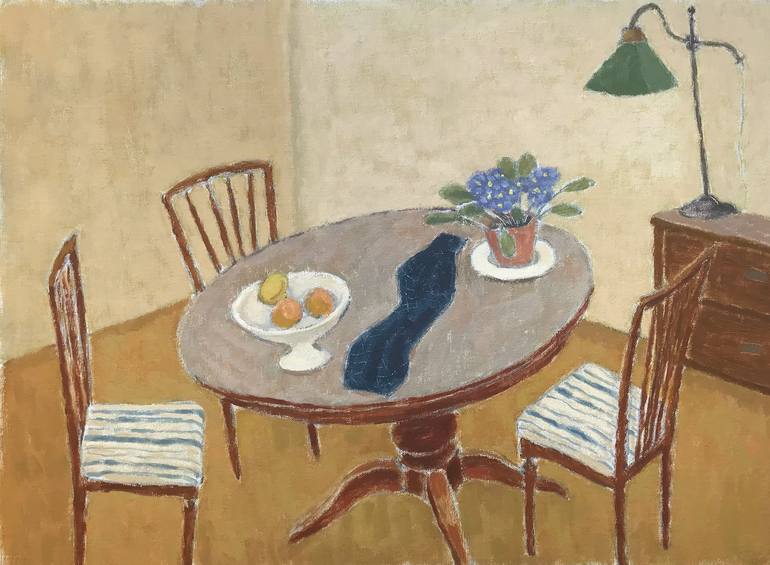 Painted from a sketch of the living room table. Oil on linen canvas.