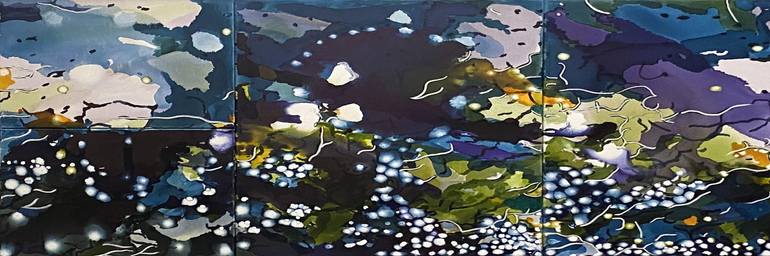 The three five-part paintings entitled "Intertwined" consist of five canvases. "What now?" Is a question for an artist in this time of uncertainty - the long break. Annette chose a color that she associates with writing, knowledge and childhood. The ink. This colored water feels faster, more fleetin...