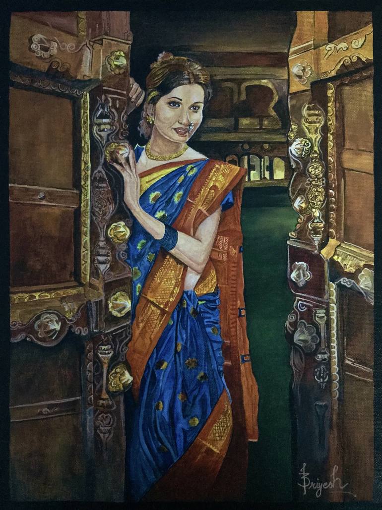Painting is Acrylic on Canvas sheet. The size of painting is 16in in height and 12in in width and in rolled state. You can choose frame design whatever you want. During the old times of 14th century, women finished their work and waiting at door for her husband. The kings were used to go on war or...