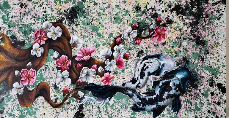 I always start with a background and let it tell me what it is going to be. The background of this piece was so peaceful and soft. I knew the fish needed to be enjoying the serenity of the splatter. The pink and white blossoms were fun and I had fun creating depth through the flowers. My favorite th...