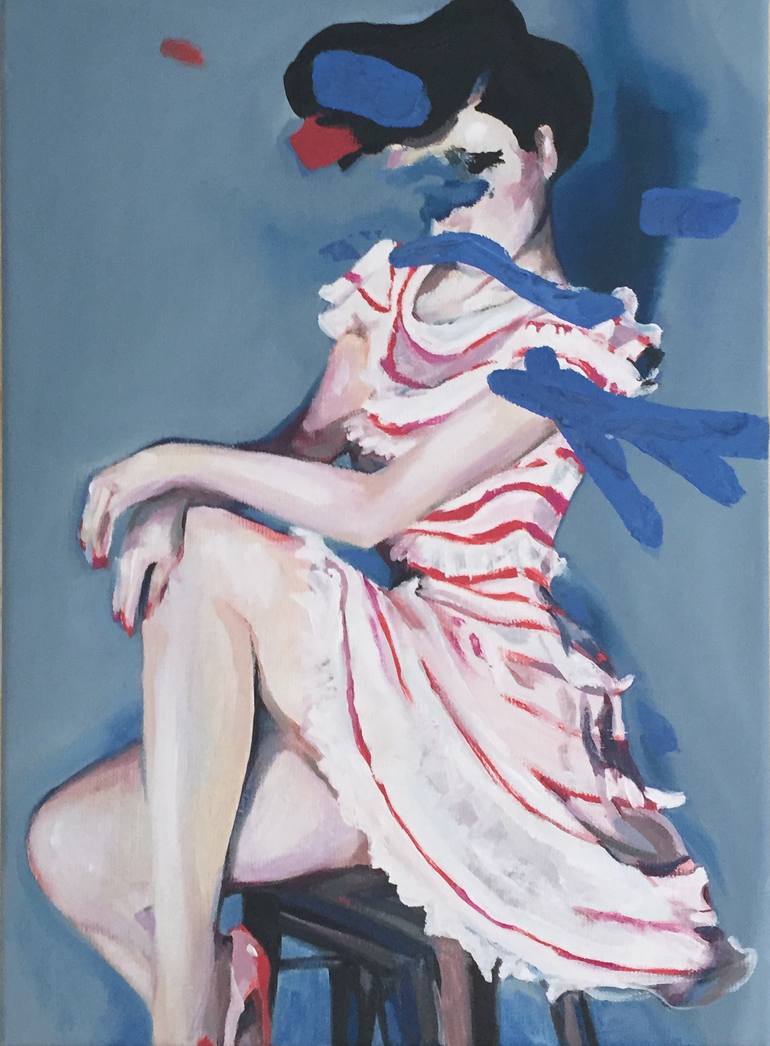 i ve painted this portrait thinking of joy, happiness. technically it is made of oils on canvas. it is not framed. the background, the color blue, is invading the subject . the skirt gives moveent to the composition. the details of red are creating rythmes. portraits is my flag subject.