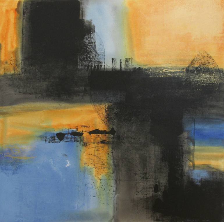 This is a continuation of the series with the same pallet of gold, black and blue.I start with brushes and washes of fluid acrylic colour and continue the painting with rollers and mark making tools.I love to let my creative energy dictate how the painting will develop.This painting is a little more...