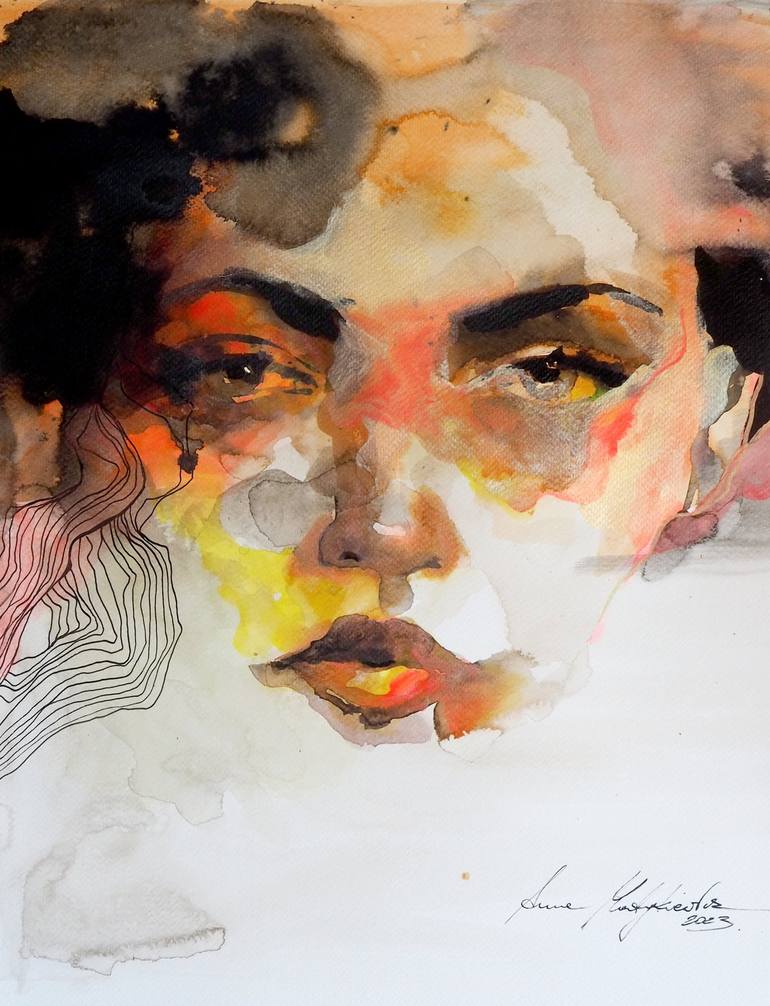Anna’s latest series, Archetypes of Resilience, explores the hidden forces behind human choice and emotional growth. Through portraiture, the work reflects on moments of uncertainty, inner tension, and transformation—where resilience is shaped over time. Inspired in part by the symbolic journey of the Tarot, the series does not recreate traditional tarot cards. Instead, it draws on their emotional and psychological themes, viewed through Jungian ideas of archetypes and shadow work. The focus is on feeling and intuition, and on the unconscious aspects of ourselves that we may resist or overlook. Each portrait is created through an intuitive mixed-media process. The work begins with spontaneous ink washes on paper or canvas, without sketches or planning. As figures gradually emerge, Anna develops them using acrylic paint, collage, and layered materials, allowing the image to evolve naturally rather than following a fixed plan.