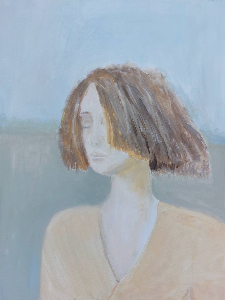 This is an emotional painting. The composition, the colors and figure are aligned. The title of the artwork is Inward-facing. The colors and the atmosphere are dimmed as well as the portrayed woman. She has closed her eyes and is in a state of dreaming/mindful.