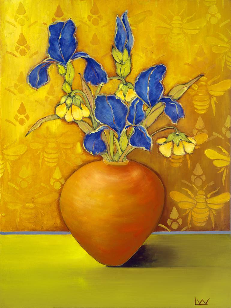 This is another piece from my Iris Series. I put a bee pattern in the background to evoke Southern France. The van Gogh influence is obvious.