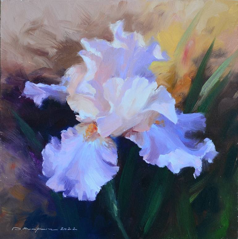 This small format work was done when the irises were in bloom. Out of the many species, I was attracted to this one with a purple-pink hue. The painting is on MDF panel with lightfast oil paints.