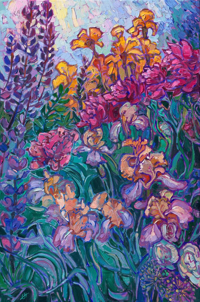 Layers of blooms come together in a tapestry of color and texture. Multi-hued irises, pink peonies, and purple lupin all celebrate the colors of spring. Erin's Open Impressionism technique brings the viewer into the painting, experiencing every brush stoke, every nuance of color and texture. Bring j...