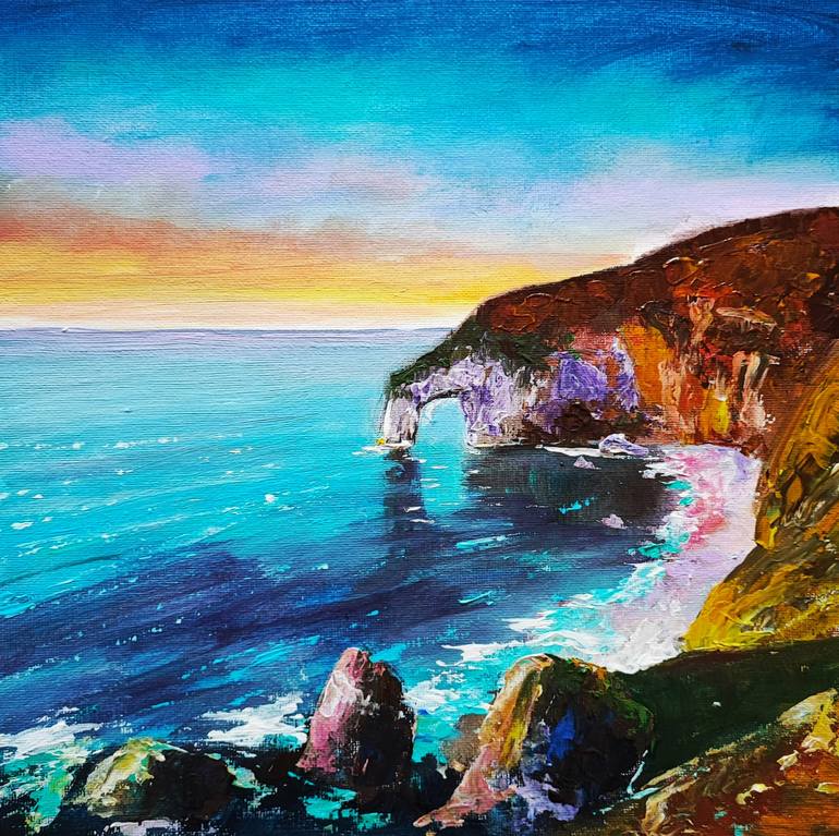 Irish Seascape Original Canvas Painting Nautical Wall Art. original fine art paintings, hand-painted, one of a kind size 12 x 12 inches materials: acrylic paints, canvas, palette knife, brushes, Bizarre stone patterns and lace line Ireland's coastline, creating caves, acres and ocean-blown cliffs....