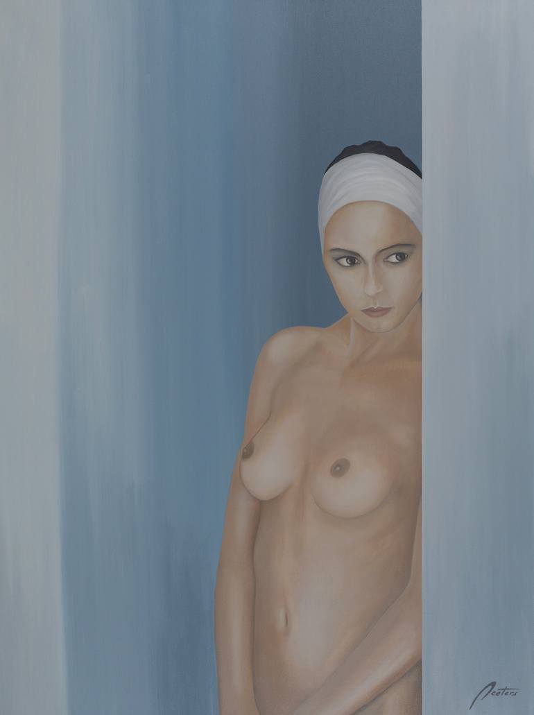 Naked woman standing behind a wall
