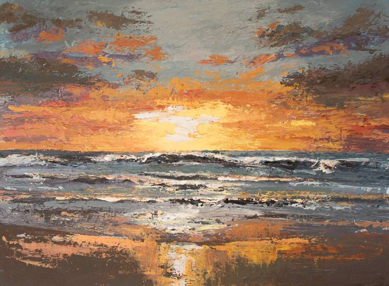 This is a palette knife seascape painting of a sunrise sunset on a beach. Color may vary slightly from your screen.
