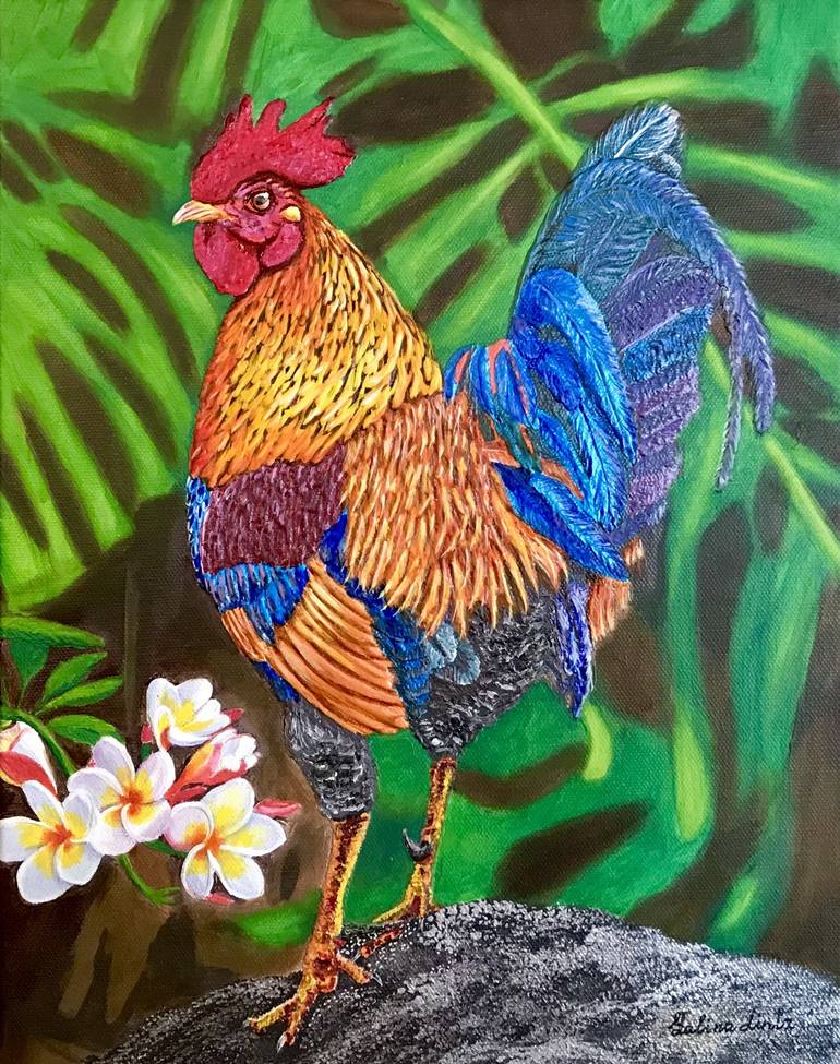 "Island's Guardian: The Hawaiian Rooster" is a vibrant and captivating original oil painting, skillfully brought to life with the use of 3D sculpting and texture paste. In this artwork, a striking and brilliantly colored Hawaiian rooster takes center stage. Hawaii is home to these remarkable wild r...