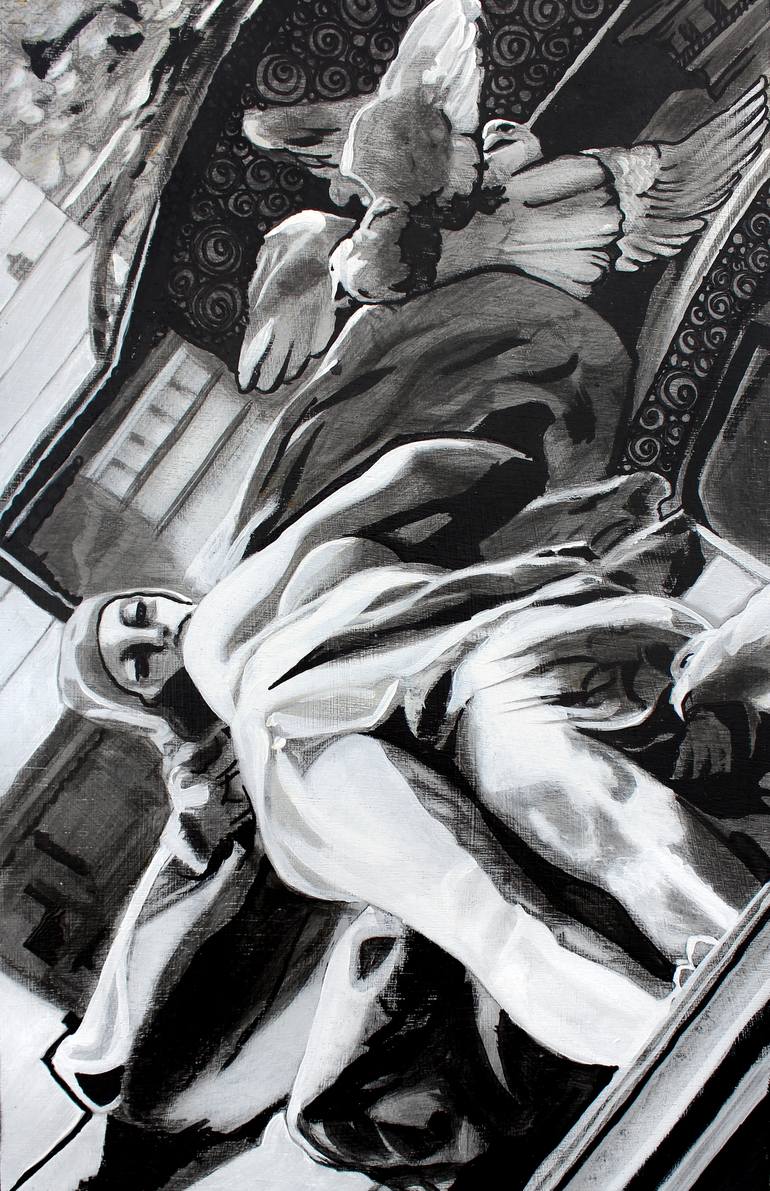 When painting, headdresses and crowns deify Kate Kelton’s subjects. She uplifts the Unsung Sheroes & Heroes, Patriarchy Smashers, Warrior Survivors, Silence Breakers, Philosophers, Truth-Tellers, Whistle Blowers and Thought Giants of all stripes. She paints her portraits cloaked in the garb of statues Ladislav Šaloun sculpted onto the train station that her great-grandfather, Josef Fanta, designed for Prague in 1901 - 1909. Apotheosis through a reclaimed, reapplied Art Nouveau. Sampling her own lineage, she transforms a historical body of work, itself a thing of lasting beauty; exchanging granite for graphite, plaster for paint. In Photoshop, she first combines the desaturated faces she's found, sourced or shot of her chosen subjects, with the black and white photos from her family and friends, of the statues in situ. Then she uses graphite, inks and acrylic paints and glazes to create the works on panel or canvas, literally uplifting and elevating her battle-weary subjects to the highest reach of architectural strata. 'Ancient and distant godlike beings, surveying a dying empire, trade places with the fresh blood of her subjects. The work presents a tactility against the digitized space, and represents a taking, an acquisition of power back from the tastemakers. Here, the mantle of the artist is above brand influencer, above internet commentator, above mere marketability. In their gaze is a warning, “Art is immortal. Come for me, why don’t you?”' ~ Micah Chaim Thomas "Kate's recent work is a matter of expansion through contrast - she is as ephemeral as her subjects are concrete architecture; she is structural when her subjects should slip through your fingers like too-fine sand. Taken as a whole, the works in her magnificent series Sentry are incredibly intelligent, but when looked at individually, you come to understand that these are statements of life beyond themselves. The series take embellishments of a Prague train station designed by her great-grandfather, Josef Fanta, and combines these with portraits of women who have stood against the sexual harassment and assault rampant in Hollywood. These women, like Kate herself, have suffered in the era where powerful men, every bit as immovable as the train station, wielded their power without check. The portraits emblazoned on architectural elements, they are marked against the edifice, every bit as permanent, and perhaps even more defining.