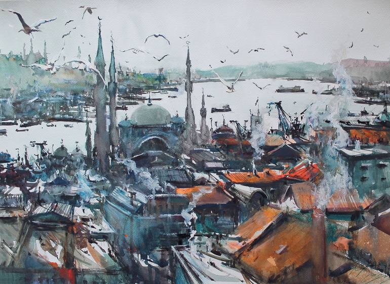 Watercolor 22 W x 15 H inches ( 57x40 cm). This is a Bird-eyes view above the roofs of Istanbul (Turkey) above the port district and laborious warehouses; on the background the Bosphorous Strait (Boğaziçi) with its Bridges connecting Europe and Asia. This piece was made in studio, dated and signed...