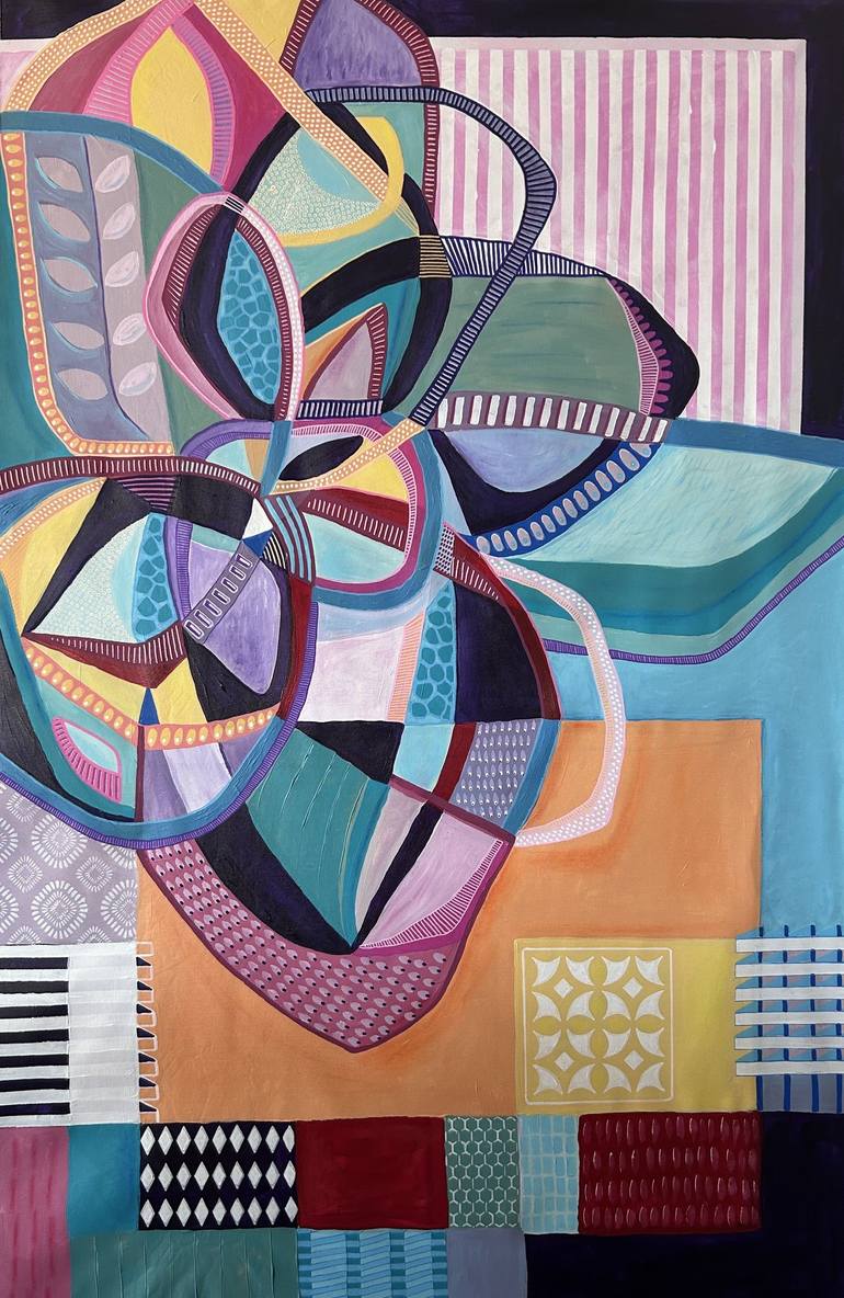 Samantha Malone is an Australian/Israeli artist based in Tel Aviv. Her work is about movement, balance, and the way shapes and color interact on the canvas. She is interested in creating compositions that feel rhythmic and alive, where structure exists but doesn’t feel rigid. Geometry often sits at the base of the work, softened by intuitive marks and a more fluid process. She works with acrylic paint and mixed media, building layers of color, line, and pattern. Shapes are adjusted, broken apart, and reworked, with sometimes parts of the surface scraped back to reveal what came before. This layering adds depth and keeps the work open and dynamic. Color is central to her art practice. She use contrast and repetition to create a sense of flow, inviting the eye to move across the surface and linger. The paintings are abstract, but they aim to feel playful, considered, and connected, leaving space for the viewer to bring their own meaning to the work. Samantha has exhibited internationally, including participation in the prestigious 2023 London Art Biennale. Her works can be found in private collections across Europe, the UK, the USA, Asia, Canada, Australia, the UAE and Israel.
