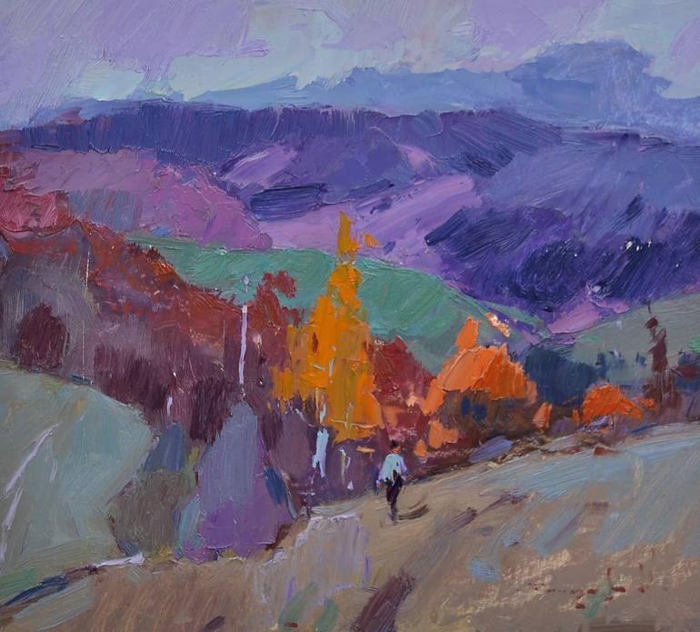 Vibrant hues of purple, orange, and green depict a hilly landscape. A solitary figure is seen walking down a path through the colorful scenery.