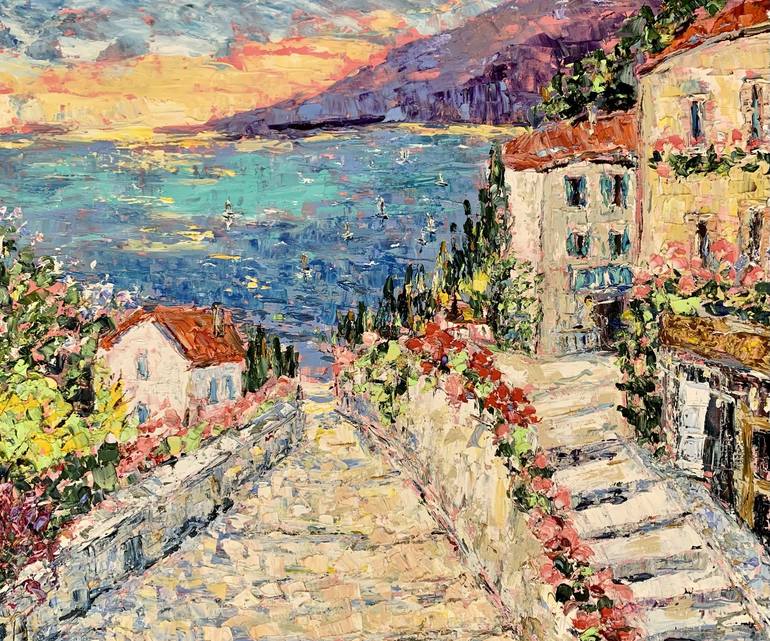 Italian Riviera Landscape Impasto Oil Painting On Canvas *Title: „Coastal town“ *Size: 23.6"x19.7" [60x50 cm] *Original handmade oil painting on canvas by brush and palette knife. *Made by me - Vilma Gataveckiene. This is not a copy or a print. *Signature on the front and on the back....