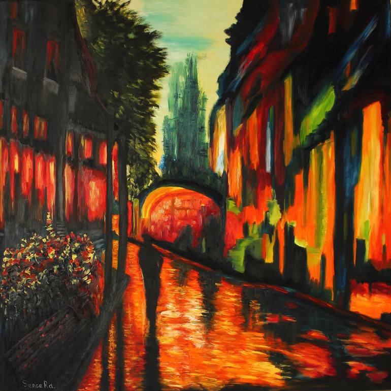 The painting is full of life and bright colors that transform the night street into a play of light and shadow. Warm colors prevail: red, orange and yellow, which mix. They contrast with the dark silhouettes of the buildings. The composition takes the eye into the depths, to a mysterious place that ...