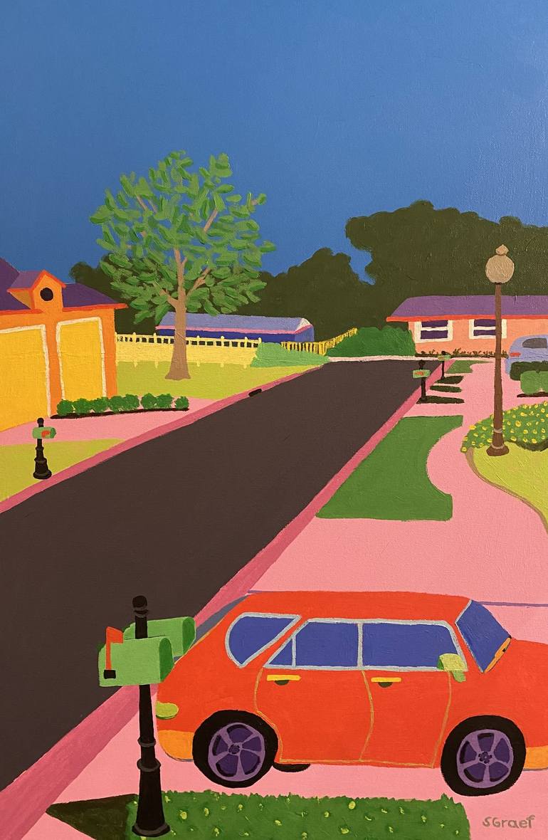 This is a landscape or street scene near the artist's home, the third of the series on Jacob Court. I was inspired by the interesting patterns and lines in the composition of the houses, mailboxes, walkways, cars and trees. So inspired I took many photos on the street and went home to paint. The art...