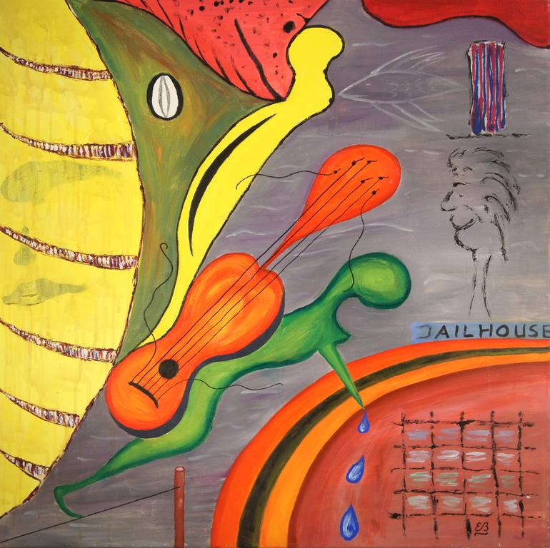Surrealistic, acrylic painting on a thick stretcher frame. Fantastic painting coming from the unconscious mind, one day when I heard about Guantanamo.