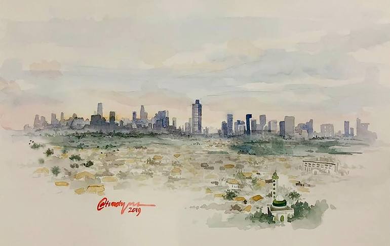"The bustling city of Jakarta comes to life in the early morning light, as the sun rises behind the towering skyscrapers and the majestic mosque. Painted on Canson paper 30x40cm 300 gsm, with Daler Rowney watercolor and Lyra brushes, this vibrant scene captures the energy and beauty of the city."