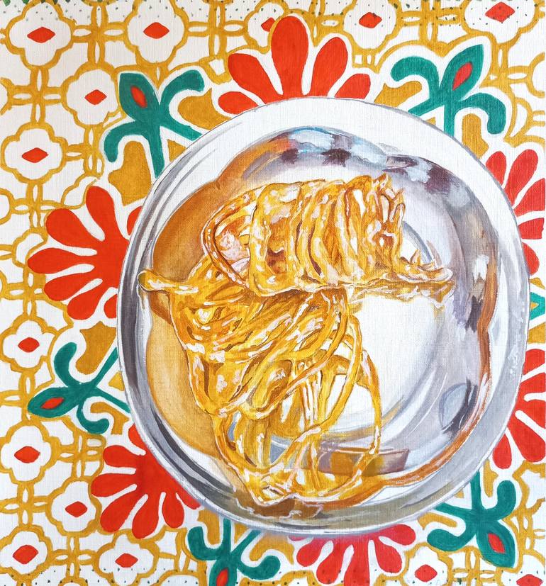 Juxtaposed with the cultural table cloth in the background, the steel plate bears the sweet snack known popularly as Jalebi. The colors used are sharp and catchy, with both pieces of attention i.e. the cloth and the snack separated by the mundanity of the steel plate. It is the distinction between t...