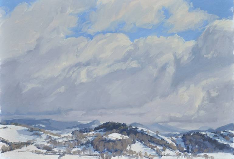 Landscape of Auvergne, France. View from the artist's studio on the Monts du Velay. When Anne Baudequin paints, the sky is almost always the source of her inspiration. She invariably starts with the sky. It is her favourite moment of painting. She takes up the exciting and complex challenge of ren...