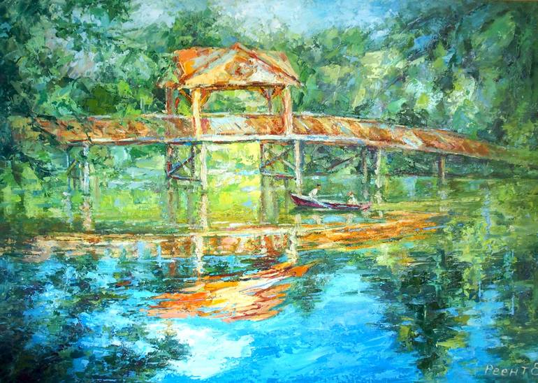A bright sunny day.The Japanese bridge is surrounded by summer greenery. Reflection dances in the water creating an exquisite pattern of architecture, clouds and trees. A heavenly place for relaxation and contemplation. The picture is painted in a rich bright color using a complex orange and green. ...