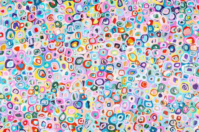 *ON EXHIBITION Until March 2026* READY TO HANG! Original painting on stretched canvas. Colorful and joyful abstract artwork painted in my "bubbles" style. A pattern of concentric circles and polka dots reminiscent of an aerial view of a field full of colorful flowers. Color palette: pink, blue,...
