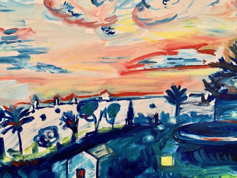 Late summer sunset view from artist's balcony in Jardines Marbella in the South of Spain