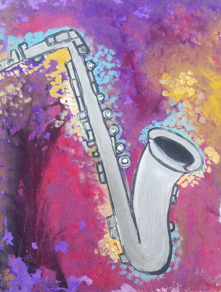 A sleek gray saxophone takes center stage against a vibrant backdrop of purples, pinks, and yellows. The abstract swirls of color create a lively contrast, enhancing the instrument’s elegant form and evoking the spirited energy of jazz. Each color seems to pulse and shift, echoing the improvisatio...