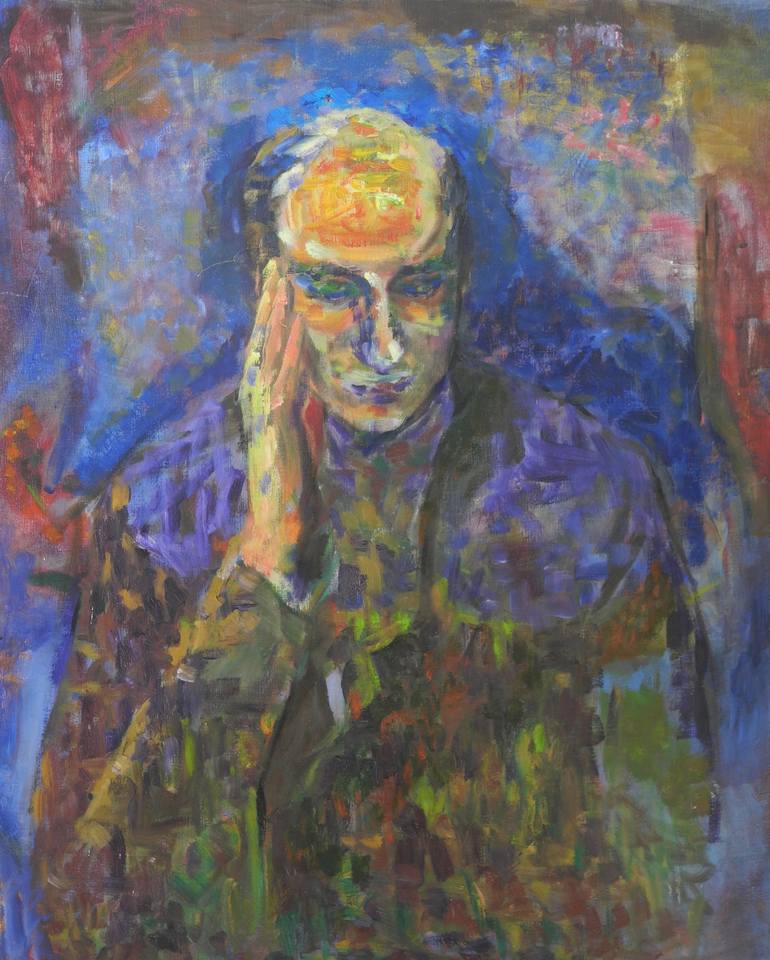 This man's universe is in his head. He looks agitated and calm at the same time. The nervous and multicolored brushwork reacts to the chaos around him. the gesture of the elegant right hand suggests composure and deep thinking. A painting in the best tradition of expressionism.