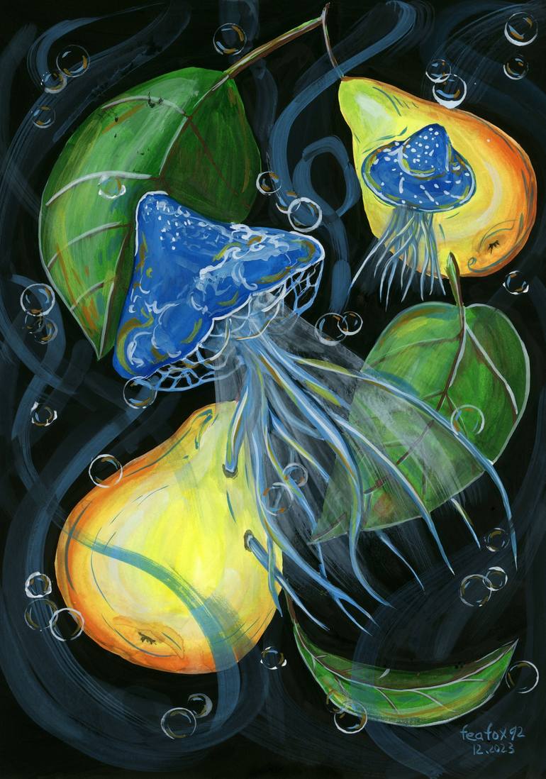 The artwork "Jellyfish and pears" is depicted with gouache paints on high-quality paper.