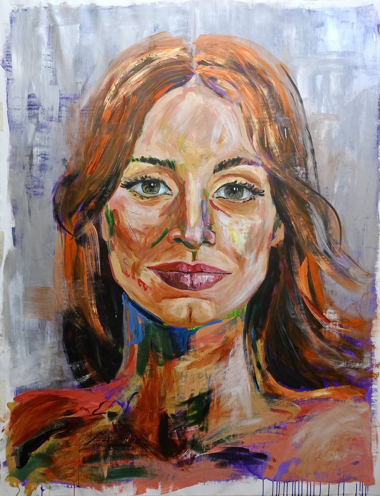 i love to depict faces of strong women that I find very inspirational to me. This is a large scale portrait painting withan expressionist style in acrylic on canvas. Seeing it live is very emotional. Jessy is a striking acrylic portrait that, with its fiery background and vivid colors, commands atte...