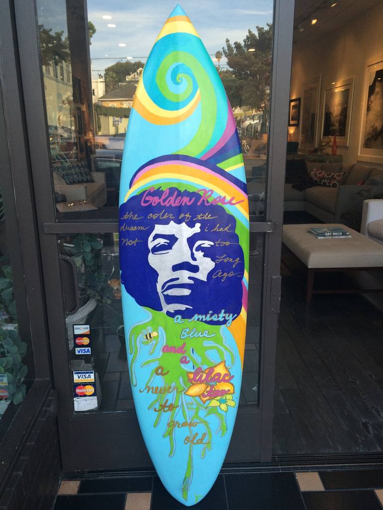 Jimi Hendrix Surfboard with one of his songs written on it. The song called "One Rainy Wish" ...Golden Rose, the color of a dream I had, not too long ago. A misty blue and a lilac too, a never to grow old"