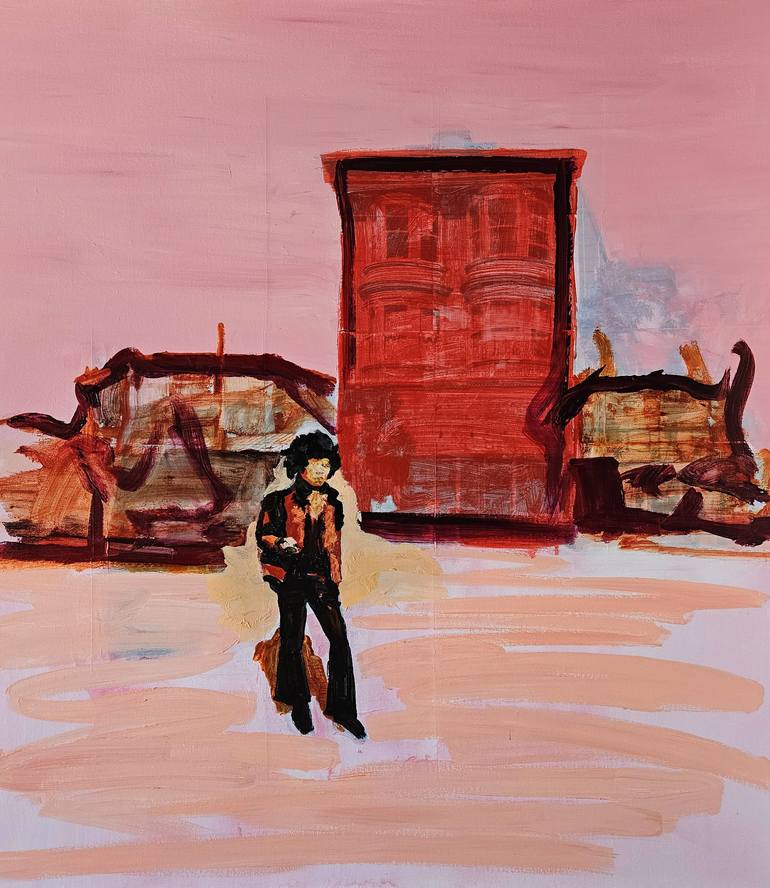 'This is where the magic happens'; magical places all over the world where great moments happened. Moments that inspire me today. This is Jimi Hebndrix in front of his Red House in at Height Ashbury SF. Truly a magical place! The technique is a combination of paint and laserprinter ink on paper on...