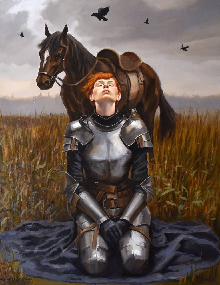 In this artwork, I wanted to show the dramatic moment of Joan of Arc's prayer. I pour the depth of contemplative strength into the figure of a young woman dressed in armor, kneeling with eyes closed, enveloped by a serene yet daunting landscape. My brushstrokes capture the silent resolve and inner p...