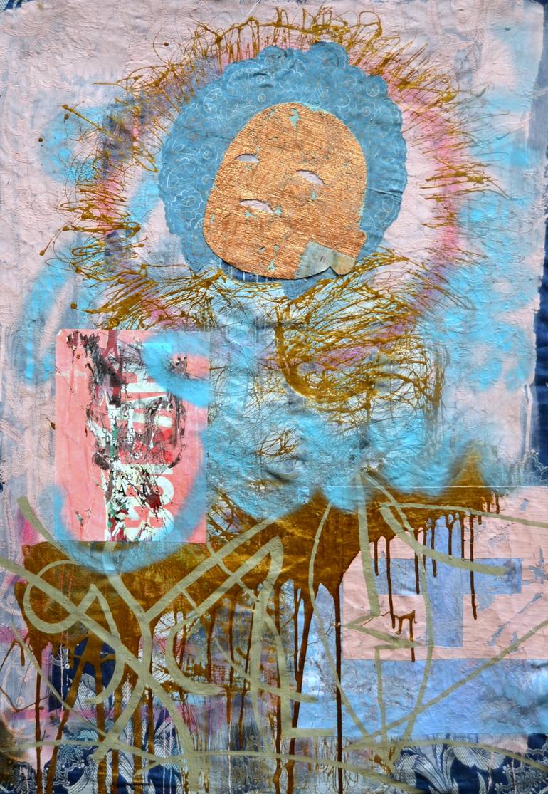This is part of a series of three paintings. In this work, street art, religious iconography and domestic textiles are infused to create an aesthetic balance through disparate influences. Its an exploration of the postmodern fractured experience, the search for meaning in the everyday. This work...