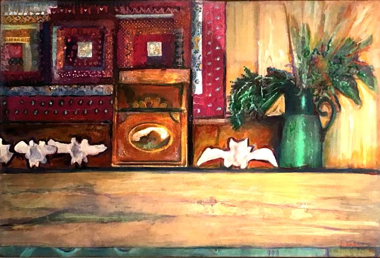 This painting is a collaboration between husband and wife. The subject is a mantle on John's Island in the San Juan Islands of Puget Sound. The cabin had no electricity. The white bones are whalebones.