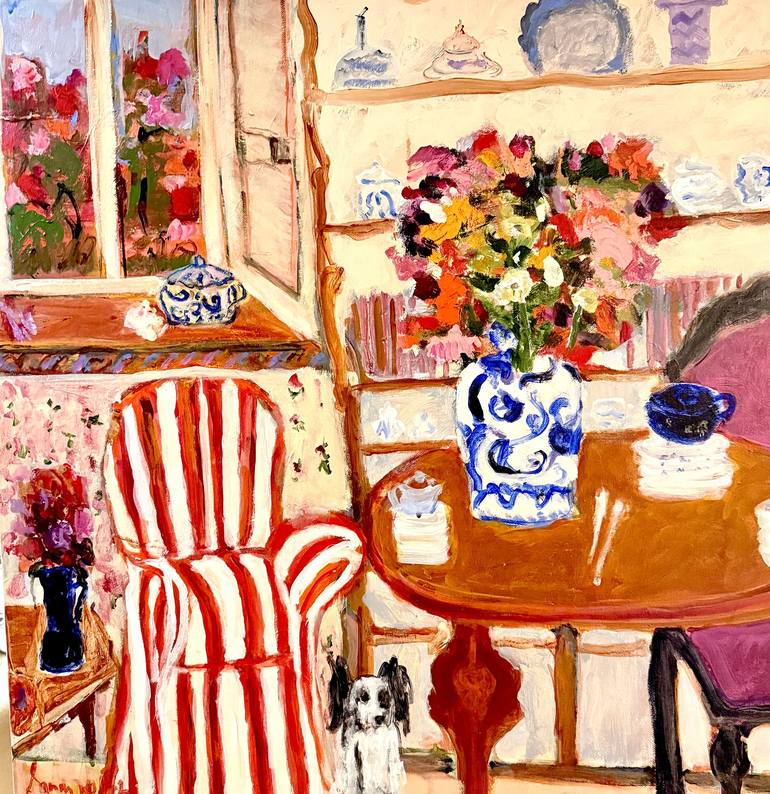 A CALAMITY OF COLOR IN THE VERY BEST WAY.....Sandy is the consummate artist. Using vibrant palettes of vivid hues, her work embodies a fresh, feminine, and passionate perspective. Whatever she does, she does it colorfully. Sandy consistently endeavors to capture the essence of her subjects, be it the pose of a fashionista, a lively beach scene, a coquettish shoe or a inquisitive Lamb. Along with a representational approach, Sandy's push toward abstraction and non-figurative renderings signals an evolving signature style; the themes and provocative palette have remained constant, but she has embraced a new manner of expressing them. With energetic mark makings and gestural flourishes of delight, she manages to keep her artistic voice fresh and full of ephemeral elements of enthusiasm and liveliness. Painting is her pulse and many of her paintings POP with provocative color and flirtatious style. Sandy looks to and through all her daily experiences as sources of inspiration. Painting, gardening, decorating, and currently working as a free-lance make-up artist for Chanel allow her to be creative. Festivity and joy are the foundations of Sandy's work, ones which she celebrates not only with each viewer, but also with her furry critics and studio mates, Tootsie her dog and his cast cousin Maurice Matisse. "Painting is not just a hobby, it is vital to my life. Summer is my mirror and fashion is my muse. My palette is filled with the delicious colors of summer. The reaction to my work is joy and happiness. I wouldn't have it any other way. I'm excited and inspired by the welcoming world that surrounds me, an islands hydrangea, a stretch of sand and beach umbrellas, a fashionable figure and, yes, all kinds of animals. This is how I choose to create my life and my art".