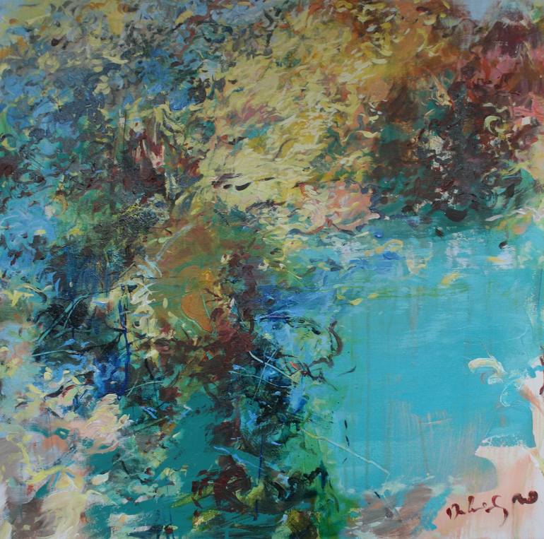 The inspiration to this artwork was a journey and observation and investigation of moving landscape. Trembling shapes of the trees and bushes, shining in the sun gave me an idea to paint this piece with impressive atmosphere of dancing trees. This is acrylic on canvas.