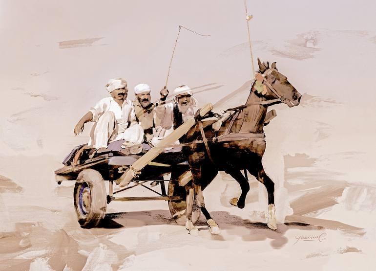 This painting depicts three men riding on a traditional horse-drawn cart in a rural setting. The earthy tones and the sketch-like style highlight the simplicity of life in a village. The expressions of the men, one holding the reins, evoke a sense of camaraderie and shared purpose. The horse, captur...