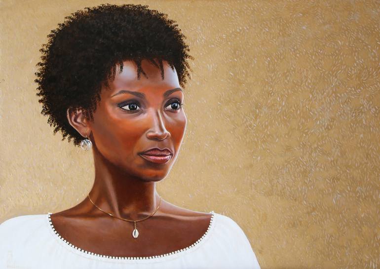 This painting is entitled "Joyce" because this African woman expresses deep inner joy. She is serene and asks us about the object of her peace. Her calm and dignity are an ornament, and her princely bearing is at once gentle and humble. I work in the manner of the 15th-century Flemish Masters, i.e. ...