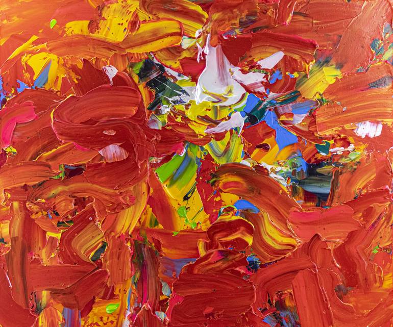 Artist Tran Tuan created this artwork with the inspiration of his feeling about the fullness of human joy. With the entangled, rhythm of the brilliant strokes of red and orange - combined with the rhythm of the white, blue, lemon yellow and white splashes, the artist excellently expresses the overfl...