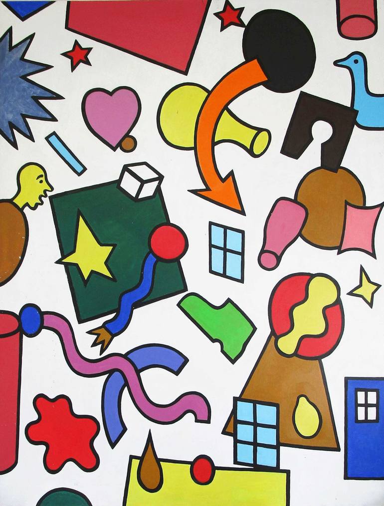 A jumble of unrelated shapes is how I see the world. Intriguing and original and lively. Flat colour and black outlines