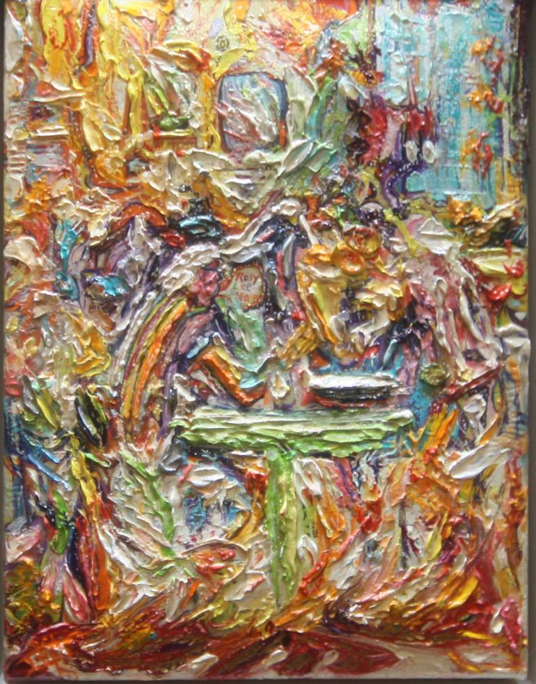 "Jumper." captures a moment of everyday life in the Birmingham art gallery cafe. Two men are enjoying a break, perhaps with tea or coffee, their conversation unfolding amidst the gallery's ambiance. The artist was particularly struck by the colorful jumper of one of the men. Created with oil on can...
