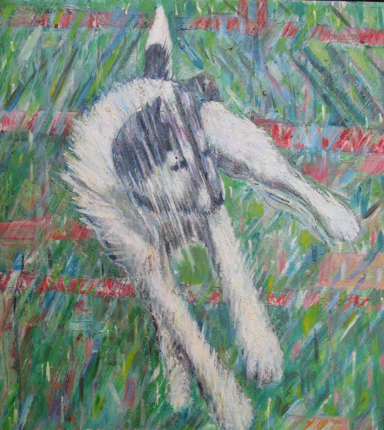 White jumping dog against a mainly green background