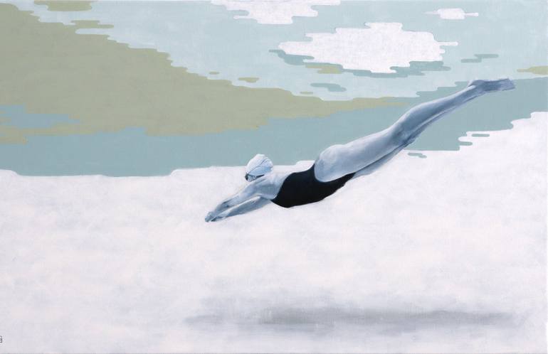 "I paint so as not to get depressed, I look for recreate the sensations I feel underwater, as a way to reconstruct that place, sometimes of security and serenity, and others of vulnerability and loneliness. I compose my images with few elements to provide visual rest: a few colours and one or two figures, which are often the same character and her reflection or alter ego. I use photography as a starting point, most of the time images that I take myself. Before painting I like to study the proportion of the figure, I draw a grid that helps me place it on the support exactly in the place I want and I draw it quite detailed. Then I paint with acrylic, due to its fast drying, the strokes do not lose spontaneity." Ana Patitú was born in 1982, in Argentina. She is currently living in Barcelona.