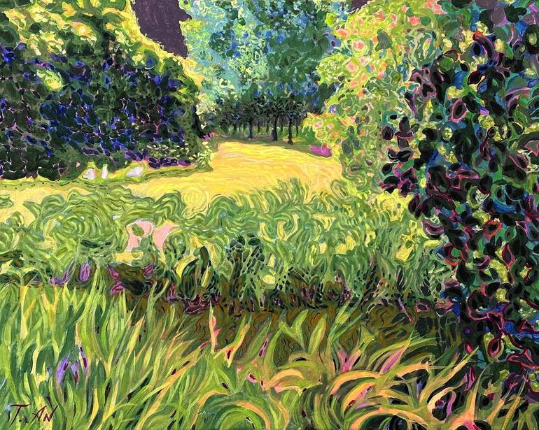 This is what I see from our terrace. Birches and lindens grow there. And there is our garage, completely overgrown with ivy. Acrylic on canvas.