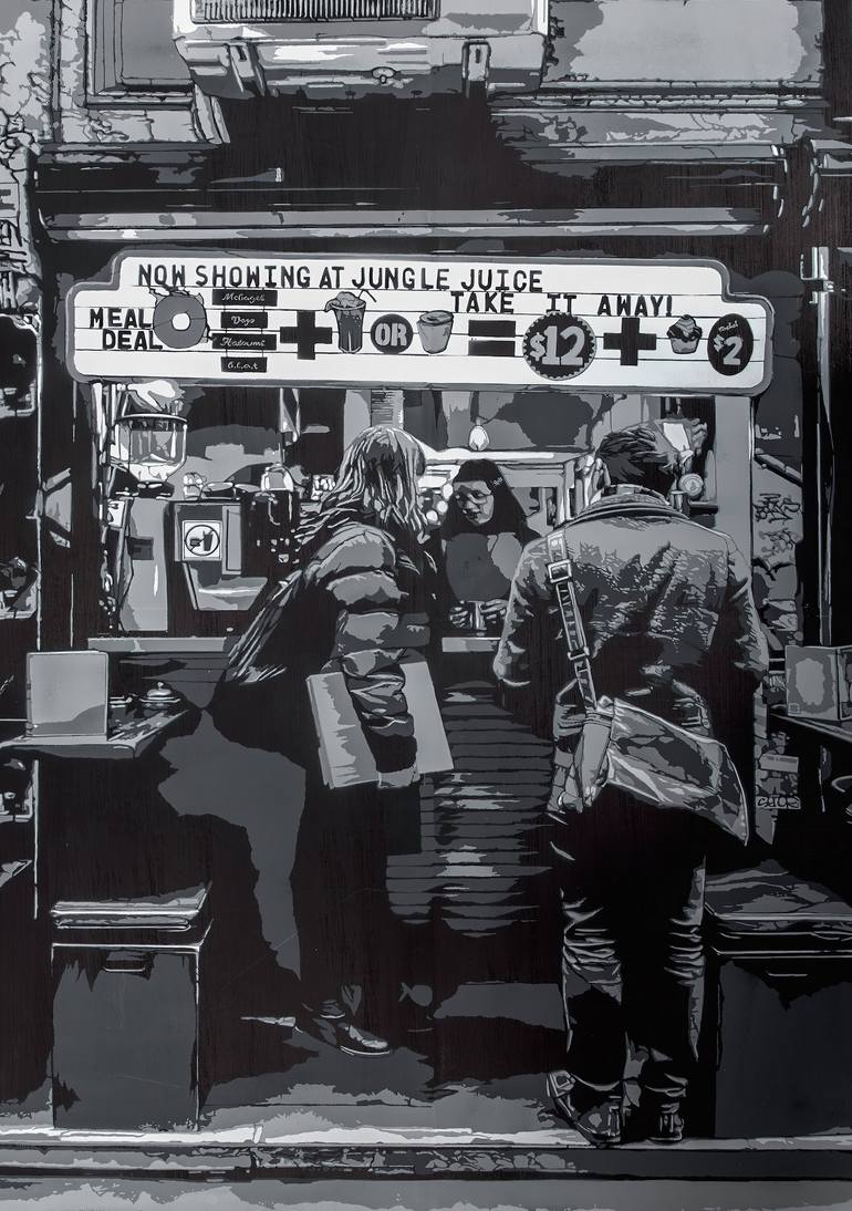 I work in the realm of stencil art, weaving threads of photorealism and urban commentary, my work is a testament to the fusion of tradition and innovation. Born in a small town in New Zealand in the early 80’s, I am a self taught Stencil Artist, Urban Photographer and Video Maker. I began actively creating art and photography in 2006 with single layer stencils. Over the next few years my style evolved and took the form of a more photorealistic approach. Each piece emerges from meticulous craftsmanship, as I hand-cut stencils from paper, sometimes investing days in each layer. This labor-intensive process becomes a meditation on patience and precision, embodying my commitment to pushing the boundaries of photorealism within the stencil medium. In 2008 I held my first solo exhibition at the Growroom Gallery in Auckland, which was a resounding success, and the following year moved to what was considered the stencil capital of the world, Melbourne, Australia. The sprawling urban environment Melbourne provided became the inspiration for my work, and as I began to explore these new surroundings I also discovered my passion for capturing city life, and finding beauty in the mundane. My thematic exploration is anchored in the urban landscape, where I delve into the nuances of urbanisation, nostalgia, and the rhythms of city life. Themes of sustainability and personal responsibility also thread through my work, echoing the imperative of conscientious living in an ever- evolving world. Since 2009 I has been selected multiple times as a finalist in the Stencil Art Prize, an annual showcase of international stencil artists held biannually in Sydney. Through my art, I invite viewers to pause amidst the chaos of urban existence, to contemplate the interplay between the mundane and the extraordinary, the ephemeral and the eternal, viewing the resilience of the human spirit amidst the concrete jungle, a whispered reminder of the beauty and fragility of the world we inhabit.