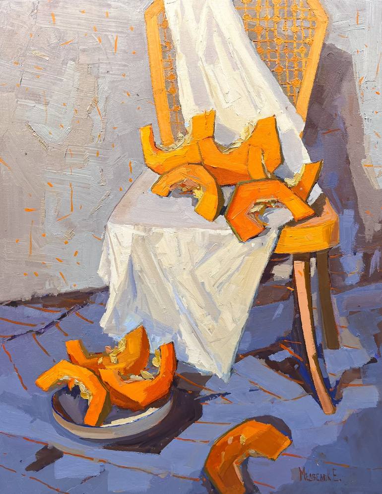 I found a pumpkin. This is a Chinese traditional Kabocha pumpkin. Its shape is unusual. This pumpkin looks like a horseshoe. It means it brings happiness. What an amazing color. Even in cloudy weather. What was I thinking? I thought about the beauty of line, about the rhythms of color. I thought abo...